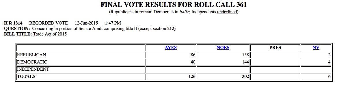 In a 126-302 vote Friday, Democrats helped reject a displaced workers’ aid program they usually support that was needed to proceed to a final vote on fast-track authority. The House then quickly voted for the fast-track measure, 219-211, though it won’t go to Obama’s desk unless the worker aid bill also passes.”