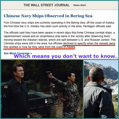 I was scrolling through my email to scan any news about Jim Harbaugh and the Mighty Michigan Wolverines as tomorrow nights game against Utah fast approaches when I came across this alert from the WSJ: Five Chinese Navy Ships Are Operating in Bering Sea Off Alaska Coast. And the thought crossed my mind, wouldn’t it be funny if the Chinese invaded and occupied Alaska while the President is “paring his bucket list” Running Wild With Bear Grylls? To quote The One: “Beats being in the office.” And it would beat GWB’s reading children’s books while the twin towers burned by an Alaskan mile. Just as a sign of disrespect it’s pretty bald faced and provocative so here’s hoping the ChiComs don’t pull the trigger and Red Dawn Wasilla. If they do I’ll be rooting for a different gang of Wolverines to take matters into their own hands and send the yellow hoard back where they came from. Zero Hedge sees it for what it is.