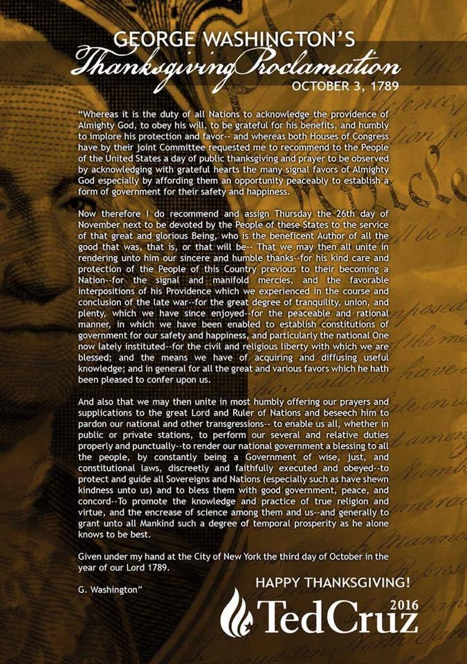 So begins one of the most pathetic Thanksgiving addresses ever delivered by a sitting President (or anyone). Starting with the informal “Hi, everybody” and ending with the concept of honoring the Indians for helping the Pilgrims in “their time of need” it’s an exercise in failure and impotence. The rest of the chat doesn’t get any better as the President of the United States of America demonstrates his utter ignorance about the National Holiday’s origin, meaning and dedication. Someone please send this Geo. Washington document to BHO and ask him to call Senator Cruz who can explain the meaning of the Thanksgiving Holiday to the Kenyan. Hint: it’s about giving thanks to God.