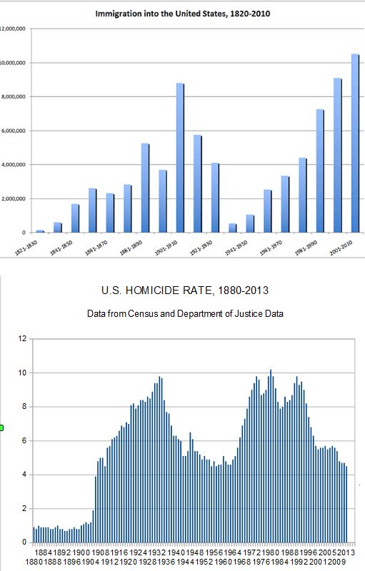 The truth is that America – the real America – is filled to the brim with guns. There are so many guns in the USA that, based on volume of firepower and ubiquity, the entire country (meaning every town, county and city) should be in perpetual violent war with hundreds of thousands dying each month. But it doesn’t happen that way does it? No, “gun violence” and just plain violence is localized in specific towns – Not Everytown. And Everytown shouldn’t have to sacrifice it’s liberty on the bloody alter of Rahm Emanuel’s true religion of Progressive Power.There is one correlation with violence in the USA that I find quite interesting in light of current debates on terror, immigration, guns violence and all the rest of it. There is an obvious connection between US immigration policy and national homicide rates – more immigrants = more murders. I know, I know, “we are a nation of immigrants” just save that crap for the TV watching schlubs who eat it up without thinking. I’m not an immigrant and I’m not shooting anybody, nor was my father an immigrant nor was his father and I’ll tell you something else – they all had guns in their house (lots of guns) and they never shot anybody on purpose or by mistake. It just might be that halting immigration is the answer to our “gun violence” epidemic. It sure beats violating the Constitution and starting a civil war.