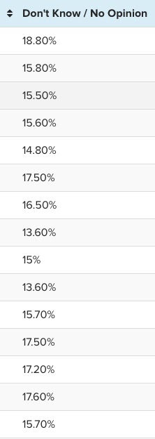 People who want a crystal ball on the November Presidential election take polls and some of these polls are extensive like when Morning Consultant canvased 44k people/citizens/voter(?) to give a synopsis of who’s the best bet for GOPers to beat Hitlery – no surprise, it’s Gov. K in a walk. More people in more States like the mailman’s son and at this point, as all thoughtful people know, Kasich is the only Republican who can win. But there’s one group of people that pollsters never seem to take into consideration when compiling winners and losers and ironically this group of simpletons are the ones who actually make the decision on who gets elected. I’m talking about the Americans who “Don’t Know” or have no opinion on the matter – they just can’t get it together to have a favorite candidate at this point in the campaign. They will decide some time in the nearish future – probably over the two weeks leading up to the first Tuesday in November but really aren’t going to bother themselves about all of this bullshit until after Labor day and maybe not until after Halloween. They don’t think there’s much of a difference in the choices and it’s all just a circus anyway where people lie and cheat and spend a lot of money making fools of themselves for the privilege of riding in limos, ordering around toadies and boot-lickers and passing laws.