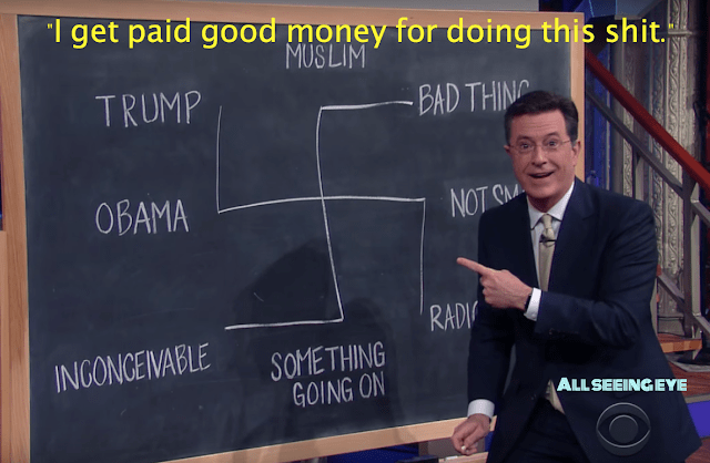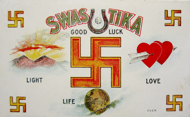 Which brings me to Steve Colbert and his Glen Beck imitation on late night TV where he connected the dots of Trump reasoning and came up with a gammadion cross, an auspicious object or symbol that’s been used as a decorative element in various cultures since at least the Neolithic age. Colbert is probably too nativist and xenophobic to realize that he’s sketching out an ancient symbol that, to his Indian and Buddhist viewers at least, has a very auspicious meaning. NOT what he’s trying to get across – he’s trying to imply that Trump is a Nazi but to do that he would have to rotate his Swastika at a 45 degree angle to mimic the Führer’s design modification adopted by National Socialists when they commandeered this symbol for the greater glory of Germany. A subtle difference to be sure and, as I point out in my comments above, the Colbert’s of this world don’t do subtlety which requires an open knowledge of culture, history and human psychology.