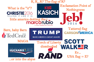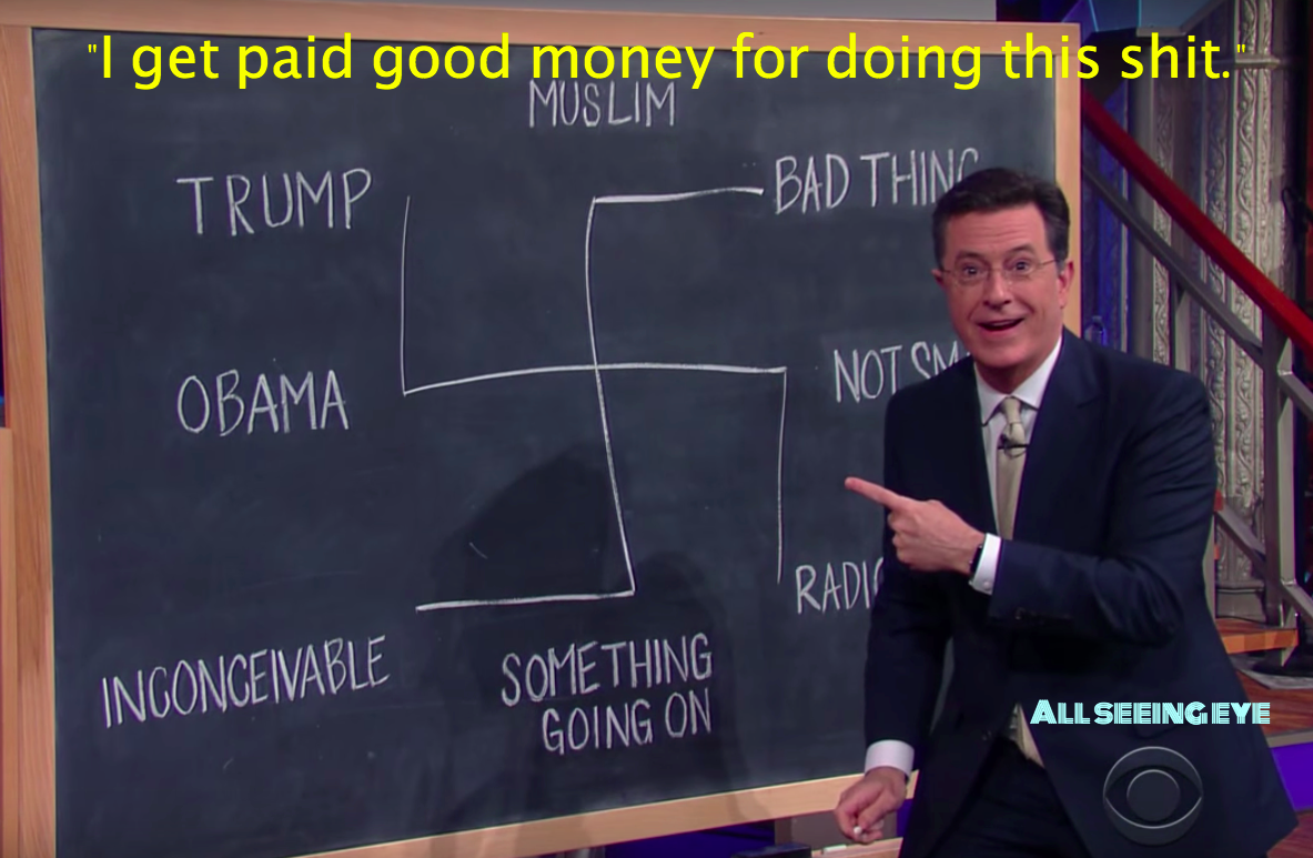 Colbert’s schtick did highlight one interesting aspect of Trump and his “movement” in that the Elvis from Queens and his many fanatics have no symbol, flag or logo (save the man’s name) to rally around and plaster all over their placards and car bumpers. What kind of totalitarian can’t be bothered to hire a Madison Ave branding company to come up with some eye catching symbol around which the knuckle dragging proletariat can rally? Almost everybody else in the GOP field paid up to get their own symbol but Trump’s got nothing. If he were able to pull the swastika out of the cesspool the Nazi brown shirts drowned it in he really would be doing a service to the world by revitalizing this otherwise glorious symbol (granted, it’s a BIG otherwise).
