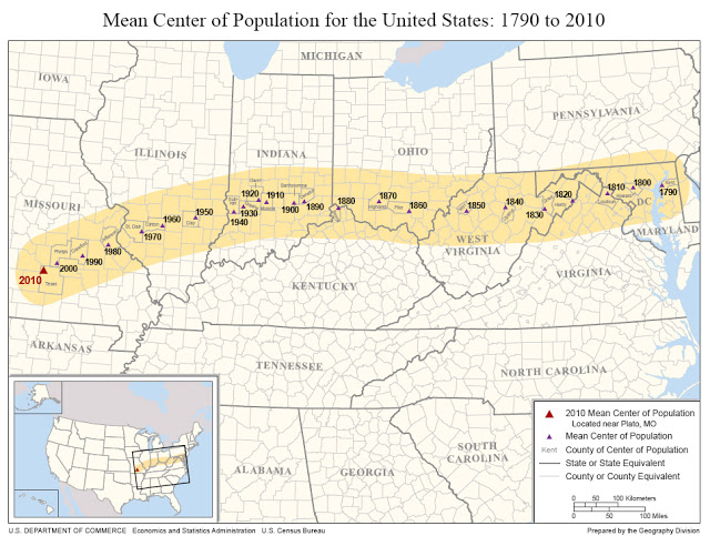 The mean population center of the USA is Plato, Mo – not some place in Ohio (that was back in 1860) and as the dots have drifted leftward and down the character of our republic has changed. Just a little more leftward and 120 miles south and we’ll end up in Hope, Ar – maybe we’ll be there by 2020.