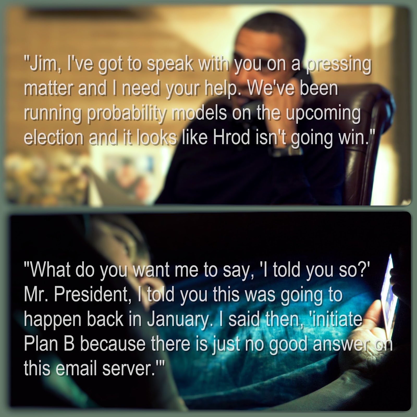 POTUS: Jim, I’ve got to speak with you on a pressing matter and I need your help. We’ve been running probability models on the upcoming election and it looks like Hrod isn’t going win.