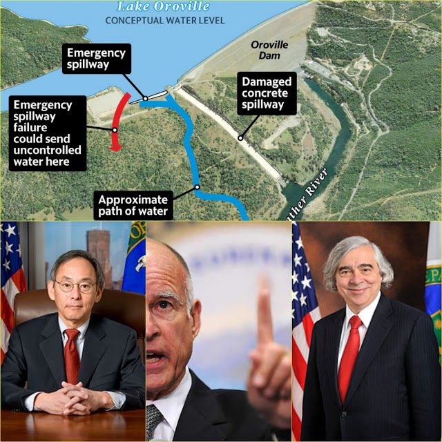 Answer: Gov. Jerry Brown, the US Department of Energy and acting Secretary Grace Bochenek (+ Ernest Moniz and Steven Chu) and a FERC civil engineer named John Onderdonk who wrote a memo in July of 2006 telling everyone that might care, which is nobody, that everything was fine with the secondary spillway.