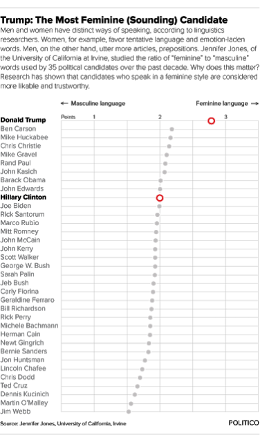 Back when our nation was in the heat of the presidential battle (late October 2016) Politico published what I assumed was a hit piece on Donald J Trump claiming that he spoke like a girl. I didn’t pay much attention to it at the time, but I revisited the article today and boy was I wrong because it turns out that Trump’s speech patterns and mannerisms are almost off the charts feminine. Look at the graph on the left which I stole from the Politico article and notice just how much of an outlier Trump is on the continuum. Not much of a difference between HRC and JEB! and things don’t really start to get overtly masculine until we get to the Biggest Little Hobgoblin in the Union towards the bottom fifth of the list but Trump… Trump is way more feminine (WAY MORE) than Jim Webb is masculine and you would be hard pressed to get more masculine than that. Trump stands alone and far apart from his political rivals and it goes a long way in explaining why the man is so captivating when he talks and why he engenders so much contempt from a certain type of woman. The prod that sent me searching for the Politico article was this incredible story in The Guardian titled “If Trump were a woman: play swaps presidential candidates’ genders” which shows a video clip of DJT vs. HRC debate reenactment with a female Elvis from Queens. For anyone who’s ever argued with a woman this video clip will feel very familiar and it confirms every point the folks at Politico were alerting us to last fall. Trump is the First Woman POTUS. His “Erratic Behavior”, “emotional maturity [and] stability”, “Purposeful, Vindictive Chaos“, “Crippling Envy“, “Vainglorious” pronouncements all validate TI’s sober warning from last October “I just know that women make rash decisions emotionally — they make very permanent, cemented decisions — and then later, it’s kind of like it didn’t happen, or they didn’t mean for it to happen.” Is that not a chief criticism, if not THE PRIMARY CRITICISM, of our current FWPOTUS? It’s ironic, but it’s now clear that the #NeverTrump, Boys Club Newsroom, Old Bull Capitol Hill and “pro-women” crones are nothing but misogynistic, sexist haters who despise women and every word, gesture and action they take. Shame! Shame on you all. So open your mind to a woman’s voice – you just might learn something.