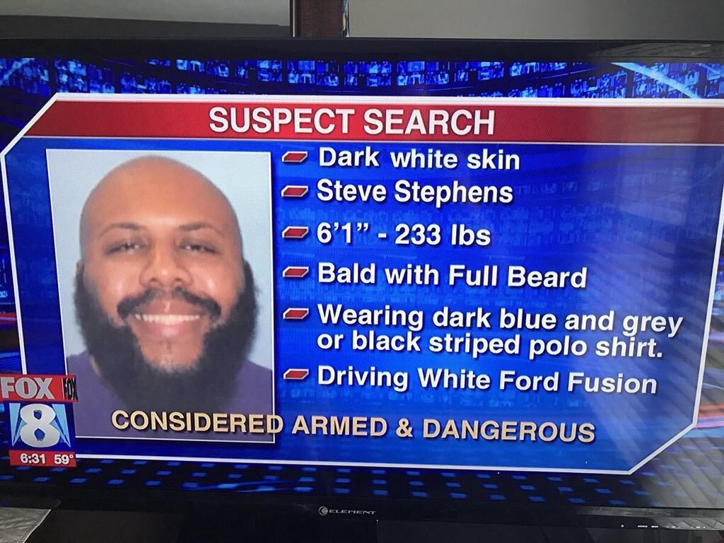Facebook is the place people committing crimes like to post videos of their atrocities so it’s no surprise that SS used this social media network to explain his motivations for killing random people. In many ways, these networks are more honest than the traditional networks that disseminate “the news” to a curious and frightened public. Since it’s such a big story and by now almost everyone in America is looking for this guy because with each passing hour he theoretically could have traveled further away from the crime scene known as Cleveland it’s inconceivable that this tall, hulking dark white skinned man could evade everyone with a cell phone and a twitter account. But that is exactly what he has done and by this time next week the manhunt will be world wide because by then he could be anywhere – everywhere! How is it that a killer like Steve Stephens can just up and vanish on Easter Sunday? Well, there are a lot of black mothers and girlfriends out there and they’ve created a lot of psychopaths just like Steve who will take him in and cover his tracks. As Joy Lane says, “Steve really is a nice guy” so someone will give him a chance.