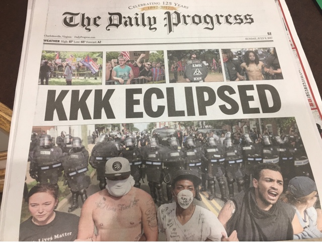 Why, the Ku Klux Klan of course. NOT a local politician (or federal politician), an educator or historian nor a celebrity could be found to defend this heroic soul but only the decedents of those scoundrels Lee refused to let join his army – the frigg’n KKK. And so last weekend 50 klan members marched at Lee Park to protest the removal of a statue of a man who would almost certainly have despised them. And that brought out the Antifa, trustifarian, SJW’s in “resistance” to white supremacy and other contemporary problems like, for instance, the US system of government and gave them cause to disrupt and hate. Which lead to the greatest headline of all time in The Daily Progress on Sundays paper proclaiming that the KKK had been Eclipsed and that, my friends, is the absolute truth. The Klan could never, even in their wildest dreams, come up with a system of oppressive terror to destabilize minority communities than the shit that’s advocated by BLM and their “progressive” comrades that include MS-13 and other organized gangs.