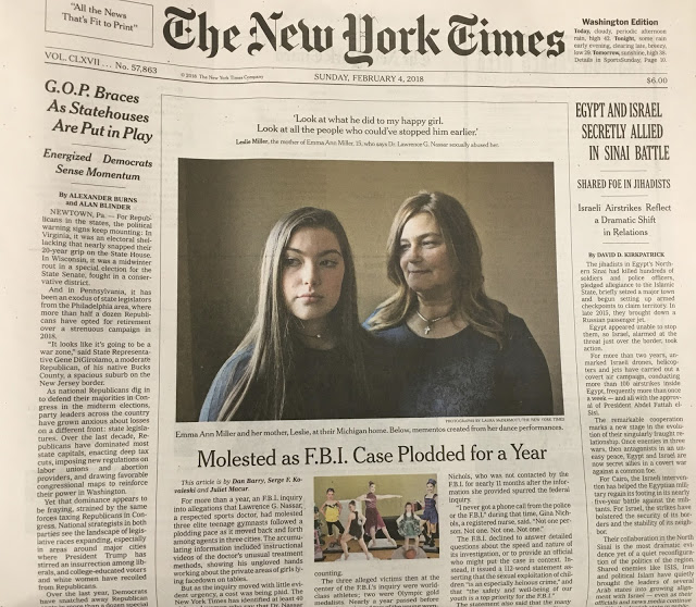 And this is not a “7th floor” problem as is often claimed by defenders of the FBI’s rank n’ file who, they also say, are just doing their jobs because they’re NOT doing their jobs. You look at the HRC email server crime, the Steven Paddock mass killing or the latest bureau black eye delivered by one, Larry Nassar, doctor of Osteopathic Medicine, athletic trainer for the USA Gymnastics national team and child molester. I don’t know if the NYTimes was just piling on but last Sunday, while grabbing some chips and dip for the big game at my local supermarket, I saw the front page of the Grey Lady (above the fold) describing how foot dragging by the FBI for over a year had subjected a number (dozens) of young girls to the perverts unorthodox methods. And how does the rank n’ file agent explain all of this process and intra-jurisdictional negotiation that allowed a sexual predator to assault so many more #MeToo victims.