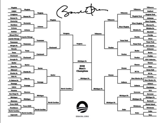 Just because I have more time to watch games doesn’t mean my picks will be better, but here are my brackets this year: https://t.co/ETRchPcZxF pic.twitter.com/gnNXw0Ysxr— Barack Obama (@BarackObama) March 14, 2018