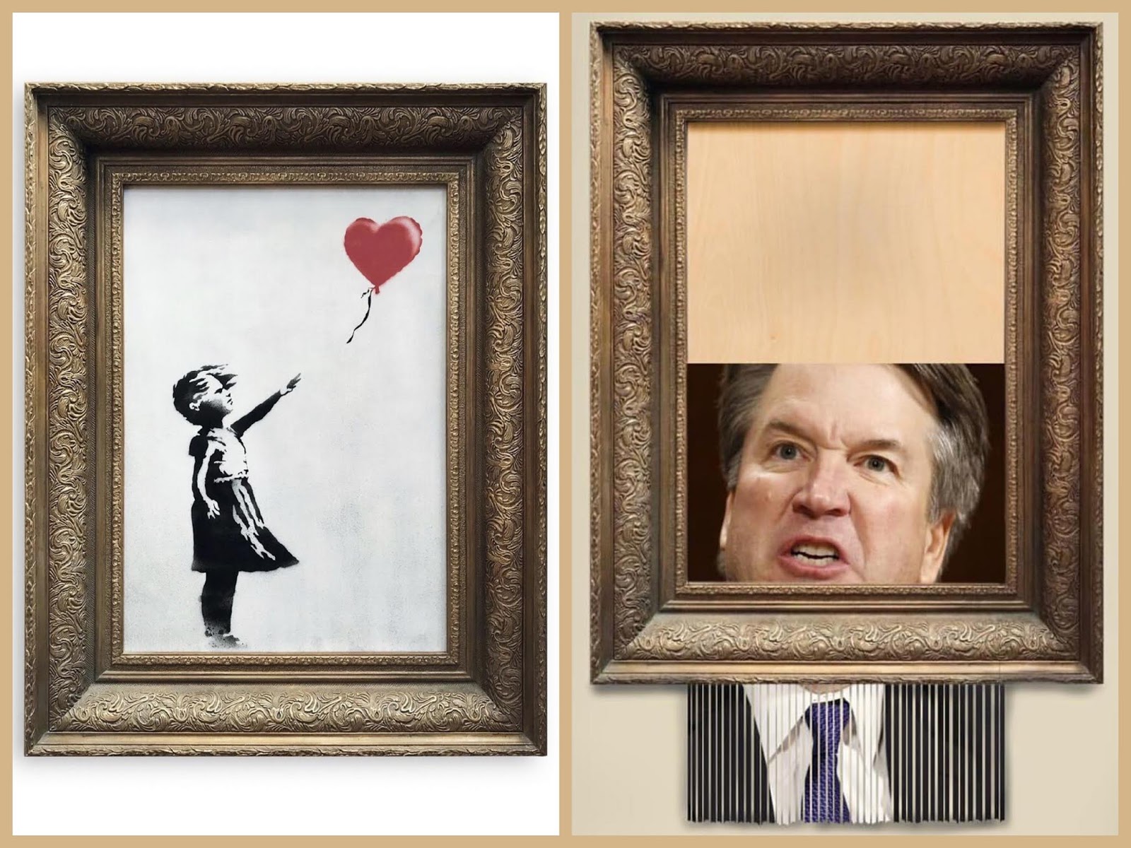 “Shortly after the auctioneer’s gavel fell, Girl With Balloon demolished itself. The artwork passed through the bottom of its golden frame, producing a partially shredded canvas. With some of the image hanging down in strips, the 2006 work of spray paint on canvas of a girl reaching for a red, heart-shaped balloon was swiftly carried off.”