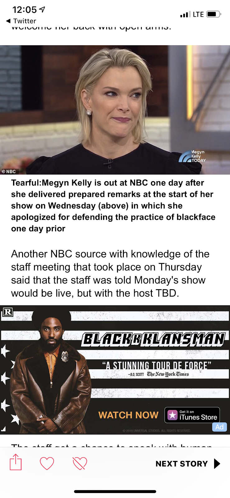 So NBC forces her to grovel like a dog, sit there crying like sap while a studio full of rubes give her a standing ovation and then, the next day, they fire her – total humiliation. That’s NBC for you but in the same frame, inserted by some soulless AI algorithm, is an advertisement for a movie about how the FBI (and other law enforcement) has been crawling up the KKK’s ass and busting up that organizations nefarious racists plans for the past 50 years. The Klan is so stupid that even a black guy can infiltrate the club and arrest them but Megyn Kelly can’t promote the idea of a white kid (or Asian or Hispanic kid) painting their face to emulate a black person because it’s “racist.” Is this what they call progress?