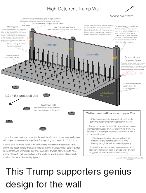 I have to admit that my conception of The Wall has been pretty constrained over the past 3 years having seen the proposed prototypes, the existing sheet metal fence (which works practically but not aesthetically) and other examples of boarder barriers erected around the world. I had been picturing some kind of combination of The Great Wall of China and the High-Deterrent Trump Wall pictured below – something that could be seen from outer space and would cost every bit of $50 Billion+ to build and maintain. In other words, an expensive eyesore that would cause maximum shock and awe to The Wall’s opponents and serve as a physical rebuke of the Folly Wall they’ve been building for the past 40 years.
