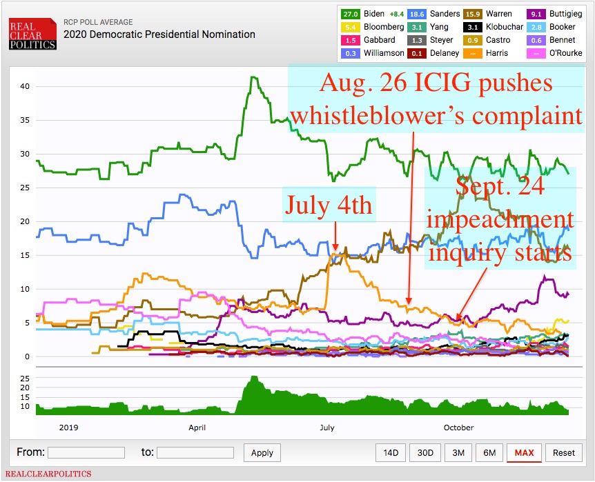 By late August Kamala’s polling was down to an RCP average of 6.5 (-10 from Independence Day highs) and that is when Human Scum Michael Atkinson pushed this preposterous “whistleblower” complaint up to the DNI and started this theater of the absurd. By September 24th Kamala was down to 5.0 in the polls and the magnitude of her failure started to sink into the thick skulls of her California donors – the same donors who finance Nancy Pelosi and Adam Schiff – and Pelosi opened an “impeachment inquiry” because “No one is above the law.” Impeachment was going to happen from that day forward – it has to happen and, if you’re a Leftist, the ends of expelling Trump justify whatever means need to be taken because they can’t beat him any other way.