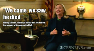 March 2011 was smack dab in the middle of the Arab Spring and the US Commander in Chief let slip the dogs of war by “leading from behind” and deploying “smart power” with a NATO-led coalition that bombed the shit out of Muammar Gaddafi. United Nations Security Council Resolution 1973 proposed by France, Lebanon(???), and the United Kingdom gave Obama and his Generals all the cover they needed to transform this, admittedly, struggling North African dictatorship into a fully whacked-out failed state. The best part of the entire operation is that no single entity was responsible for the carnage because nobody really declared war or even asked permission to attack the Libyans or even prepared The People through Congressional debate and the fig leaf of a resolutions approving the “use of force” whatever that is. NATO just did it and so Obama could blame the EuroTrash Technocrats and, get a load of this, “Libyan society” itself for the horror that unfolded as a direct result of his Imperial Presidency, Commander in Chief, Executive Order. The only person that kind’a, sort’a took responsibility for the the attack was Sec. of State HRC who, in her Julius Caesar mode, joked, “We came, we saw, he died.” Hahahahahahahaha!